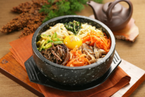 Bibimpap adalah masakan korea berupa semangkuk nasi putih dengan lauk di atasnya berupa sayur-sayuran,daging sapi,telur,dan saus pedas gochujang.