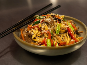 Japchae adalah hidangan gurih dan sedikit manis berupa mi kaca yang di tumis dengan sayuran,yang populer dalam masakan korea. Japchae biasanya di sajikan dengan dangmyeon sejenis mie selofan yang terbuat dari pati ubi jalar,mi di campur dengan berbagai macam sayuran,daging,dan jamur,serta di bumbui dengan kecap dan minyak wijen.